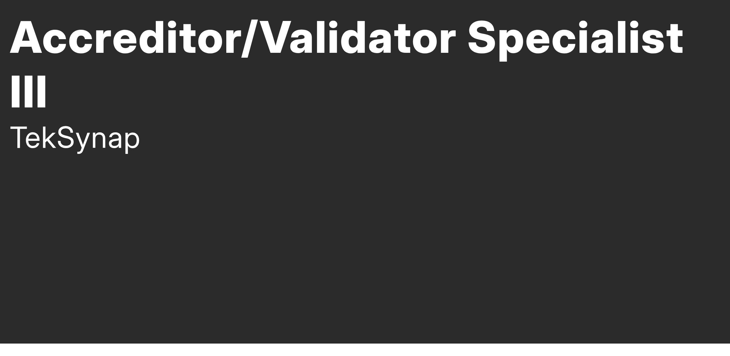 We are seeking a Accreditor/Validator Specialist III to join our team supporting Department of Navy.