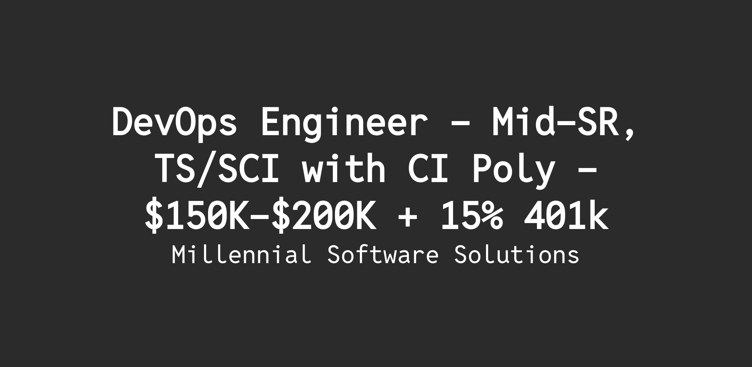 Millennial Software is seeking a DevOps Software Engineer to join our team. You will be working closely with a talented team to deliver a complex software application into operations. In addition, you'll have the opportunity to grow and hone your skills with other talented members at Millennial Software. Our ideal candidate is a DevSecOps Engineer who is a hard charging self-starter that can come onto a team and begin to produce quickly. You should have a strong understanding of IaC, containerization, automated test, and deployment pipelines to evolve our existing software infrastructure and architecture.
