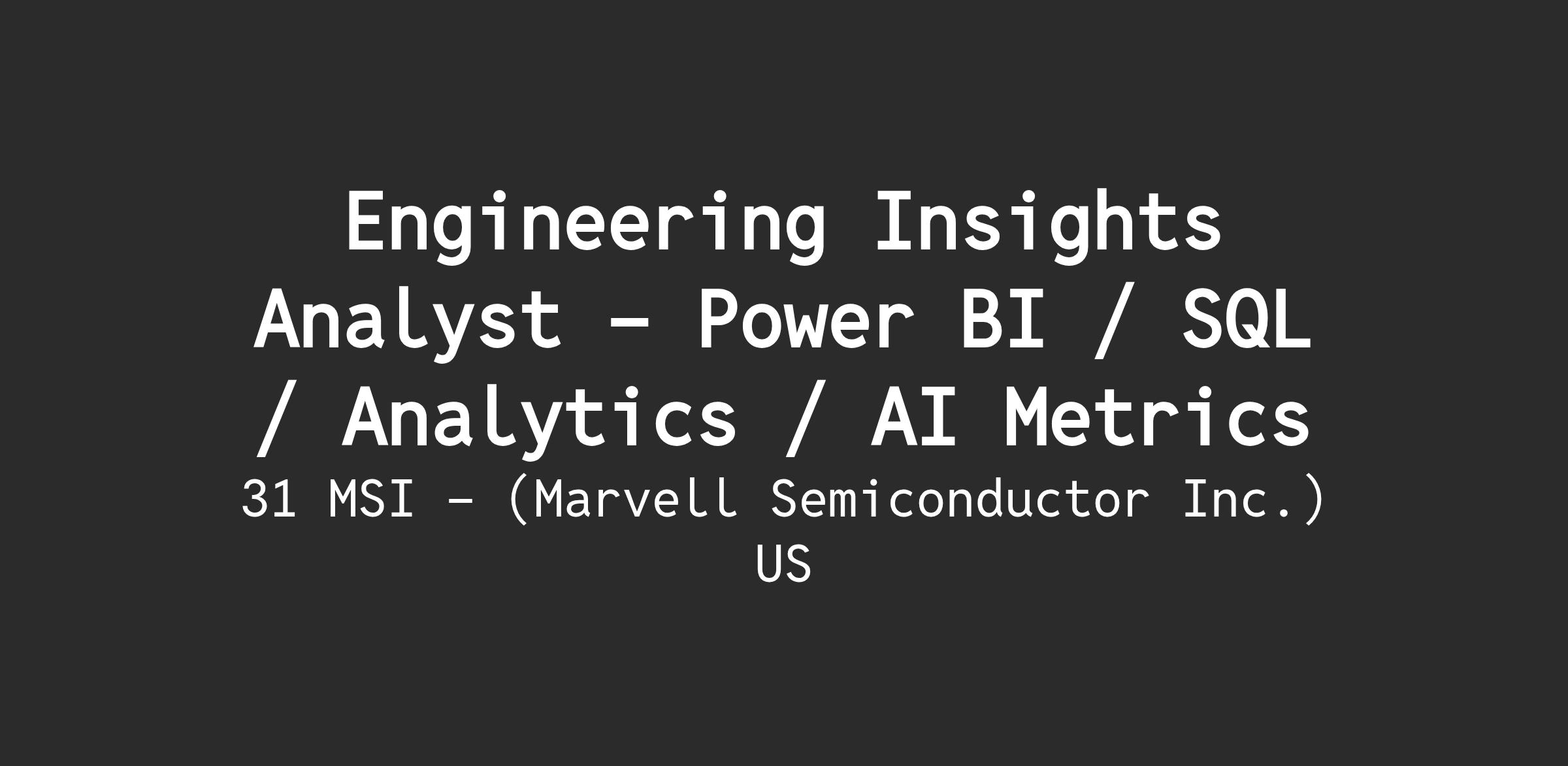 The MBE AI Strategy & Enablement team drives engineering productivity and operational excellence across Marvell’s Software & Firmware Division. We define and track the metrics that matter - from developer efficiency to lifecycle impact - providing leadership with the insights needed to make high-confidence decisions at scale. Our work touches every major engineering function, giving you a front-row seat to how data shapes strategy across a global organization.What You Can Expect