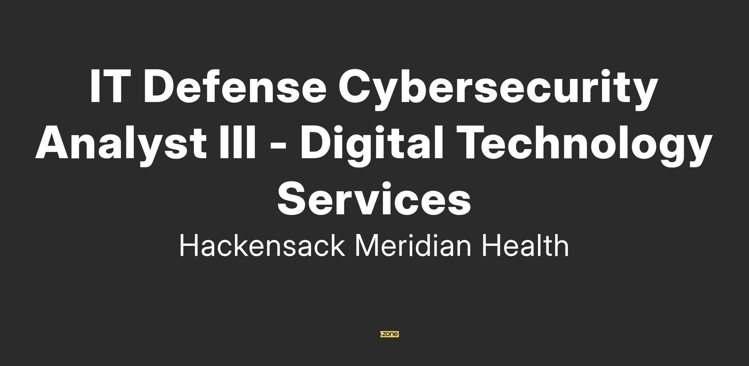The Defense Cybersecurity Analyst III is responsible for effective monitoring, detection, analysis, and response to cybersecurity events and incidents to protect Hackensack Meridian Health¿s (HMH) systems and data. Analyze cybersecurity events, investigate incidents, implement and maintain cybersecurity tools, and provide technical expertise to support cybersecurity operations. Involves collaboration with other Digital Technology Services (DTS)/Information Technology (IT) teams and cybersecurity vendors to contribute to efficient cybersecurity operations and incident handling.