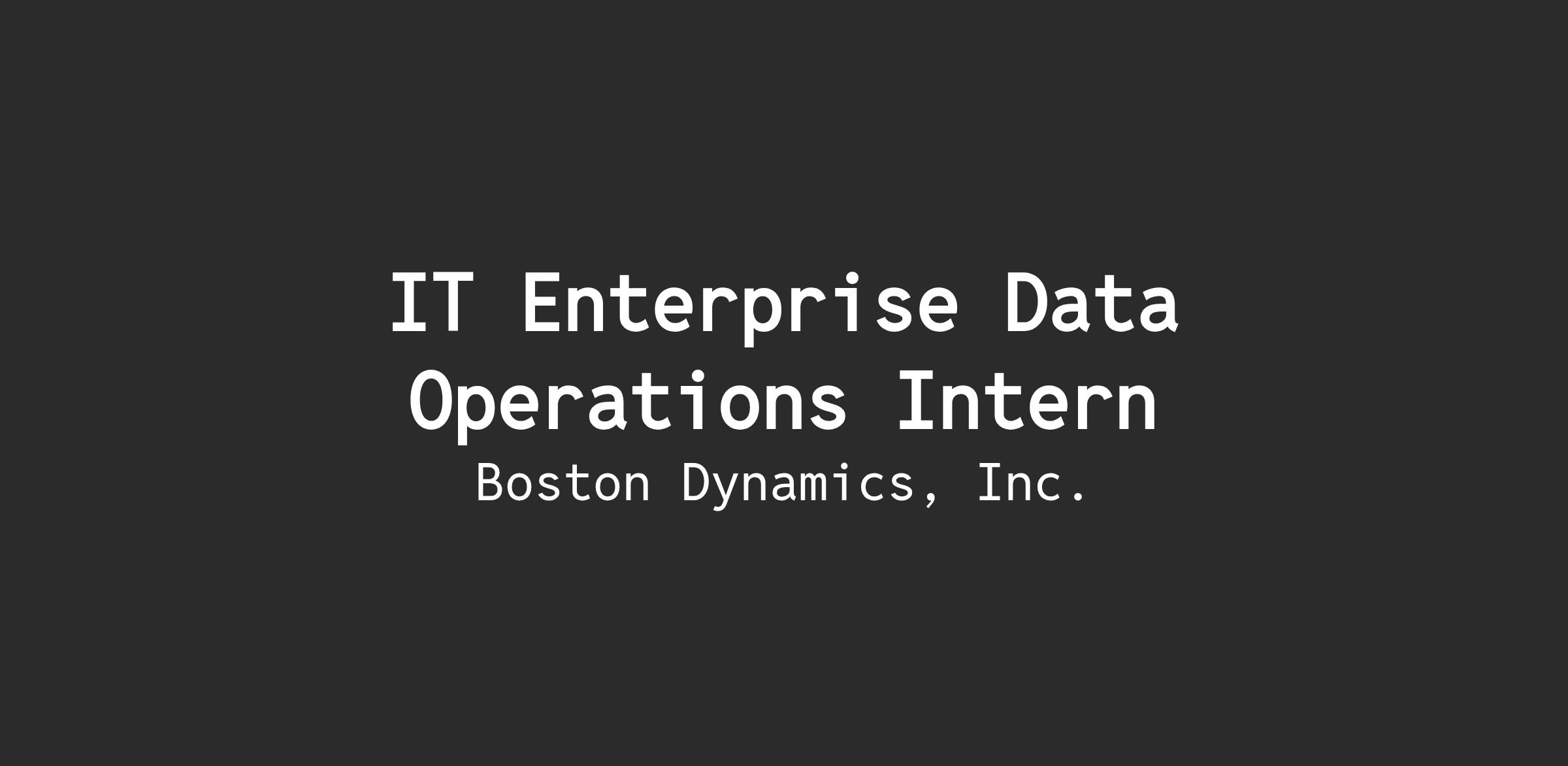 The IT Enterprise Data Operations (EDO) team focuses on delivering and supporting capabilities that enable data analysis, data visualization and decision-making. This empowers Boston Dynamics's employees to connect and collaborate more easily, collect and mine data for analytical insights, and enhance performance across all aspects of Boston Dynamicsβs value chain. The IT intern (summer) will have an opportunity to work in each of these areas as a fully-immersed member of the Enterprise Data Operations team.