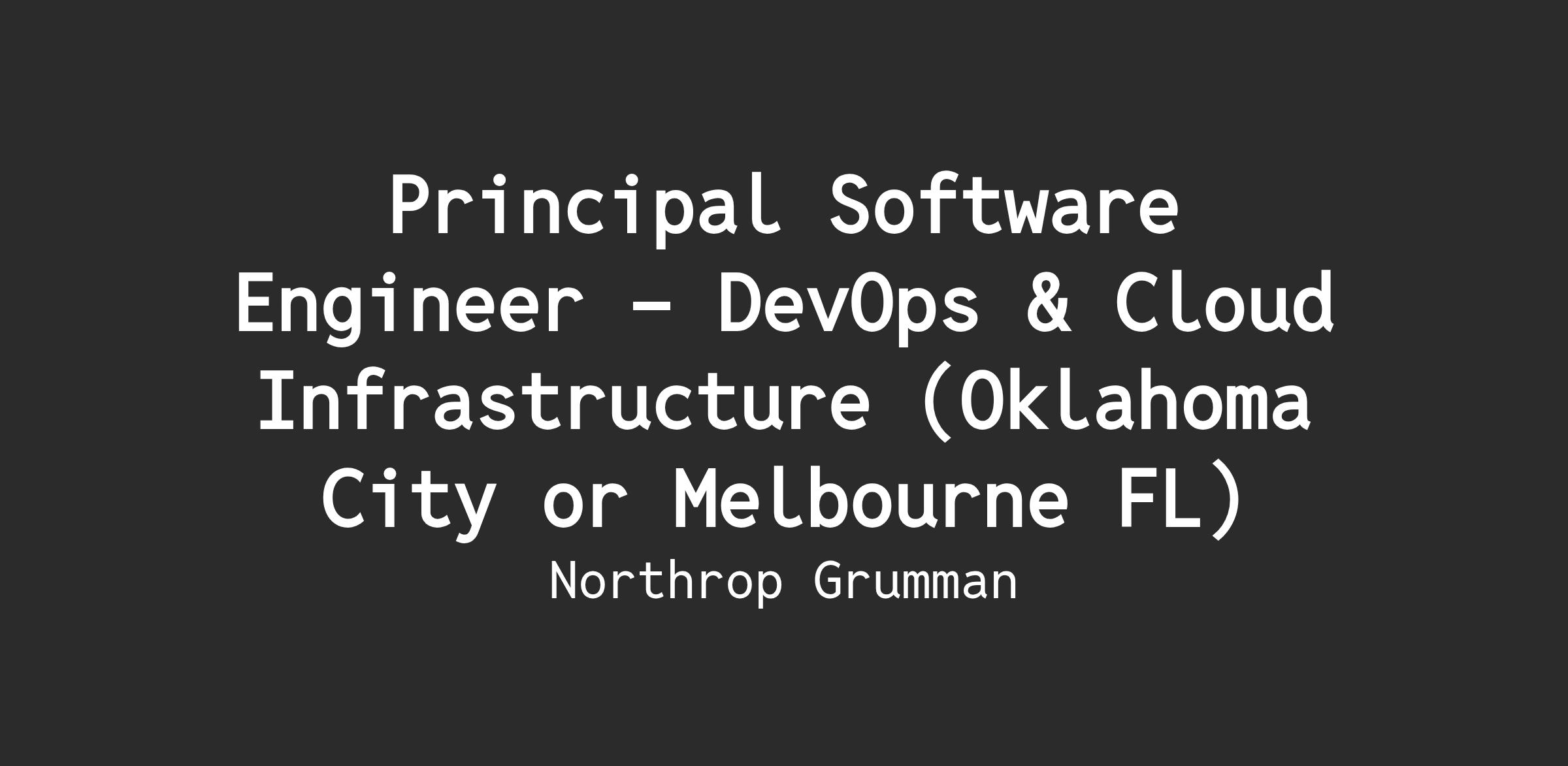 Northrop Grumman Aerospace Systems has an opening for a Principal Engineer Software - DevOps & Cloud Infrastructure to join our DevOps and Cloud Infrastructure team of qualified, diverse individuals. This position will be located on-site in Oklahoma City Oklahoma or Melbourne FL.