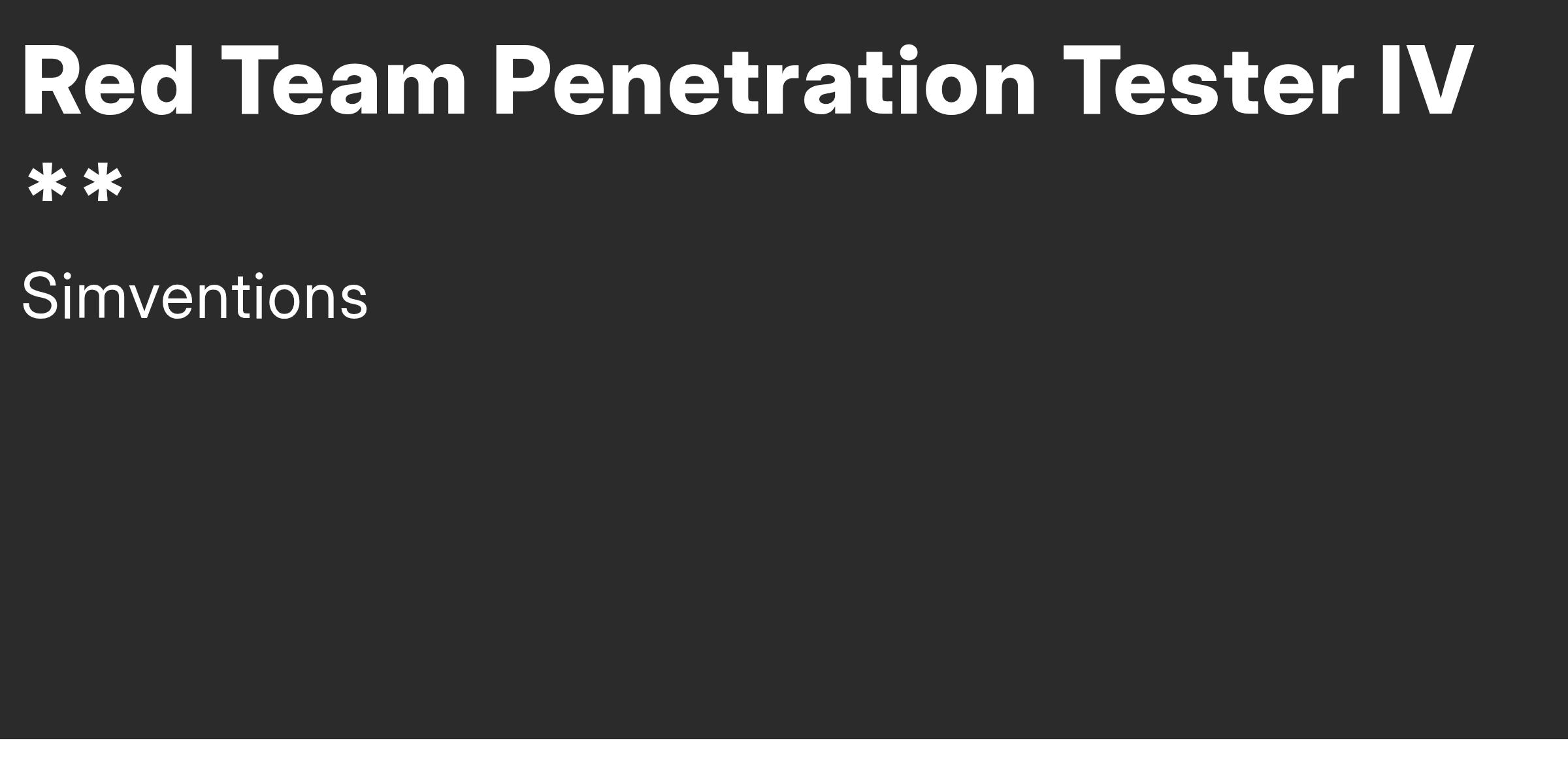 SimVentions, consistently voted one Virginia's Best Places to Work, is looking for an experienced professional to join our team! As a Red Team Penetration Tester IV, you will be responsible for leading and executing complex penetration testing events and conducting offensive cybersecurity operations for the U.S. Government and DoD systems. You will work collaboratively with Blue Team and Cybersecurity professionals to enhance overall cyber posture.