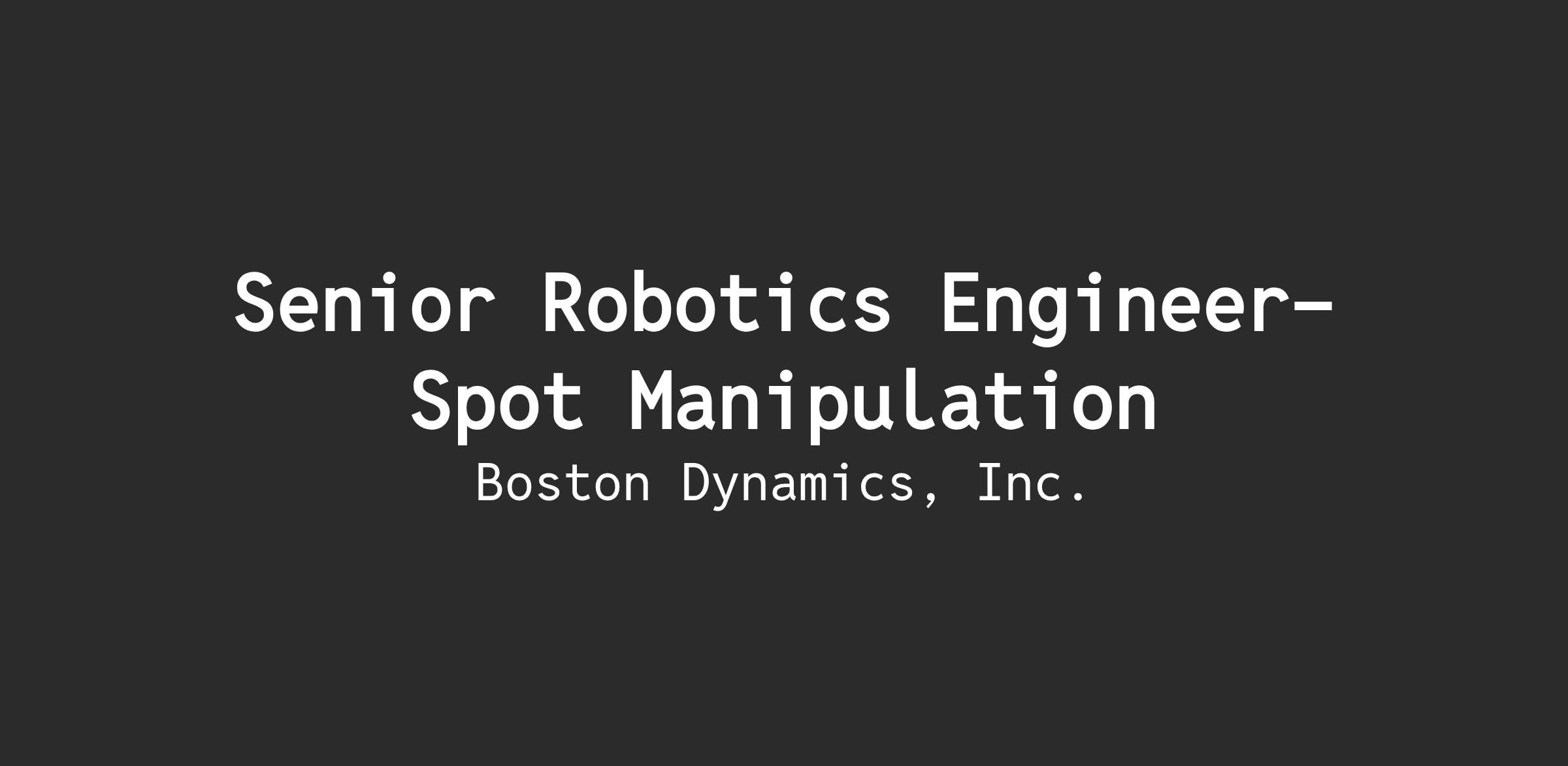 Do you have a passion for applying state-of-the-art controls and machine learning techniques to solve real-world problems? As a Robotics Engineer on the Spot Manipulation team, you will be a key contributor to tackling some of the most challenging technical problems in robotics. Your role will focus on the hands-on development and implementation of a data-driven manipulation stack. We are investing in reinforcement learning and behavioral cloning as key technologies for achieving dexterous and robust loco-manipulation that can be deployed in real-world environments. Success in this position requires ambitious ideas, rapid and meticulous execution, and a collaborative mindset within a dynamic, fast-paced team.