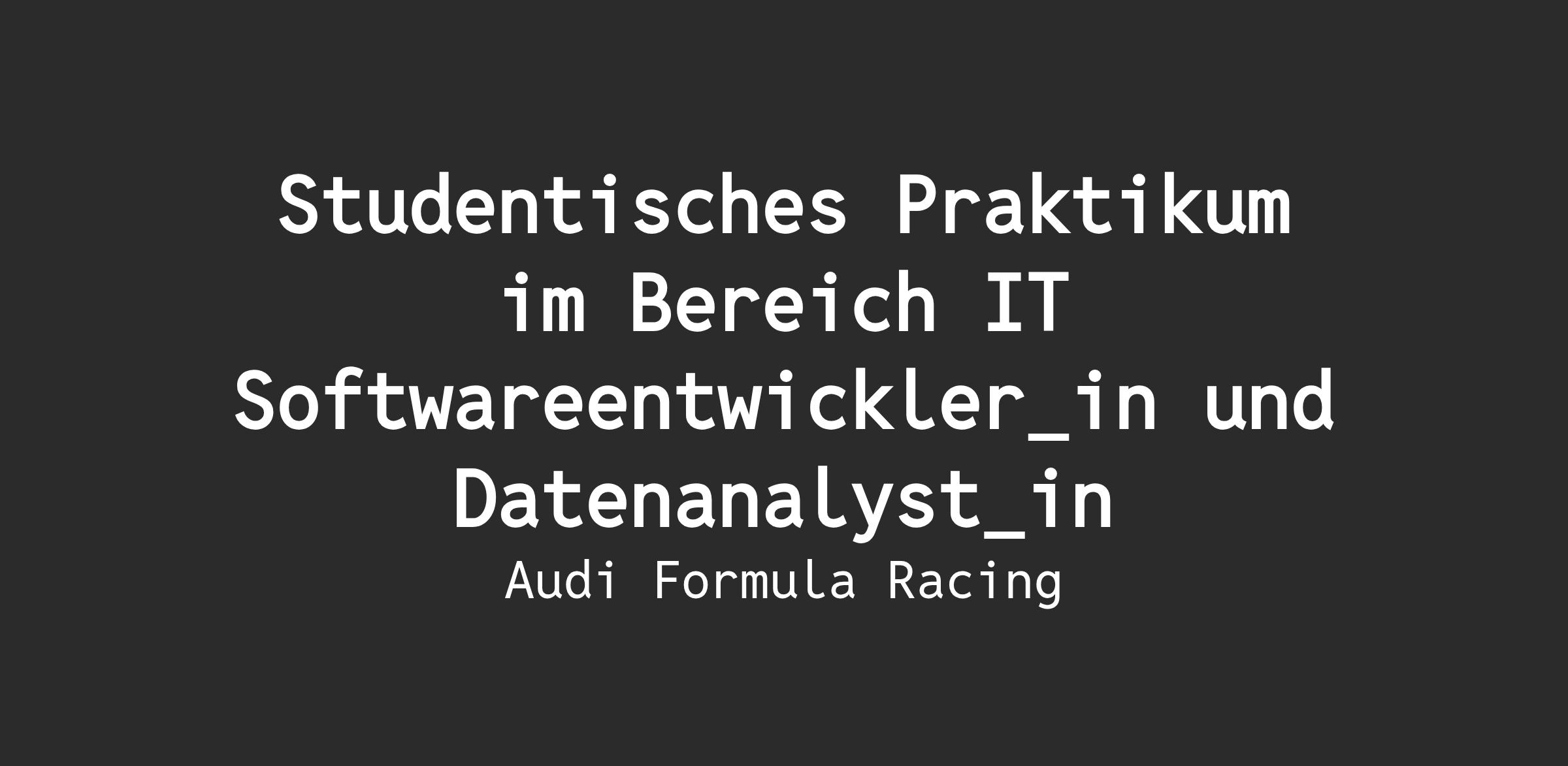 - Du unterstützt bei der Analyse, Konzeption und Entwicklung unterschiedlicher Softwarelösungen für die Audi Formula Racing GmbH mit dem Schwerpunkt Data Analytics