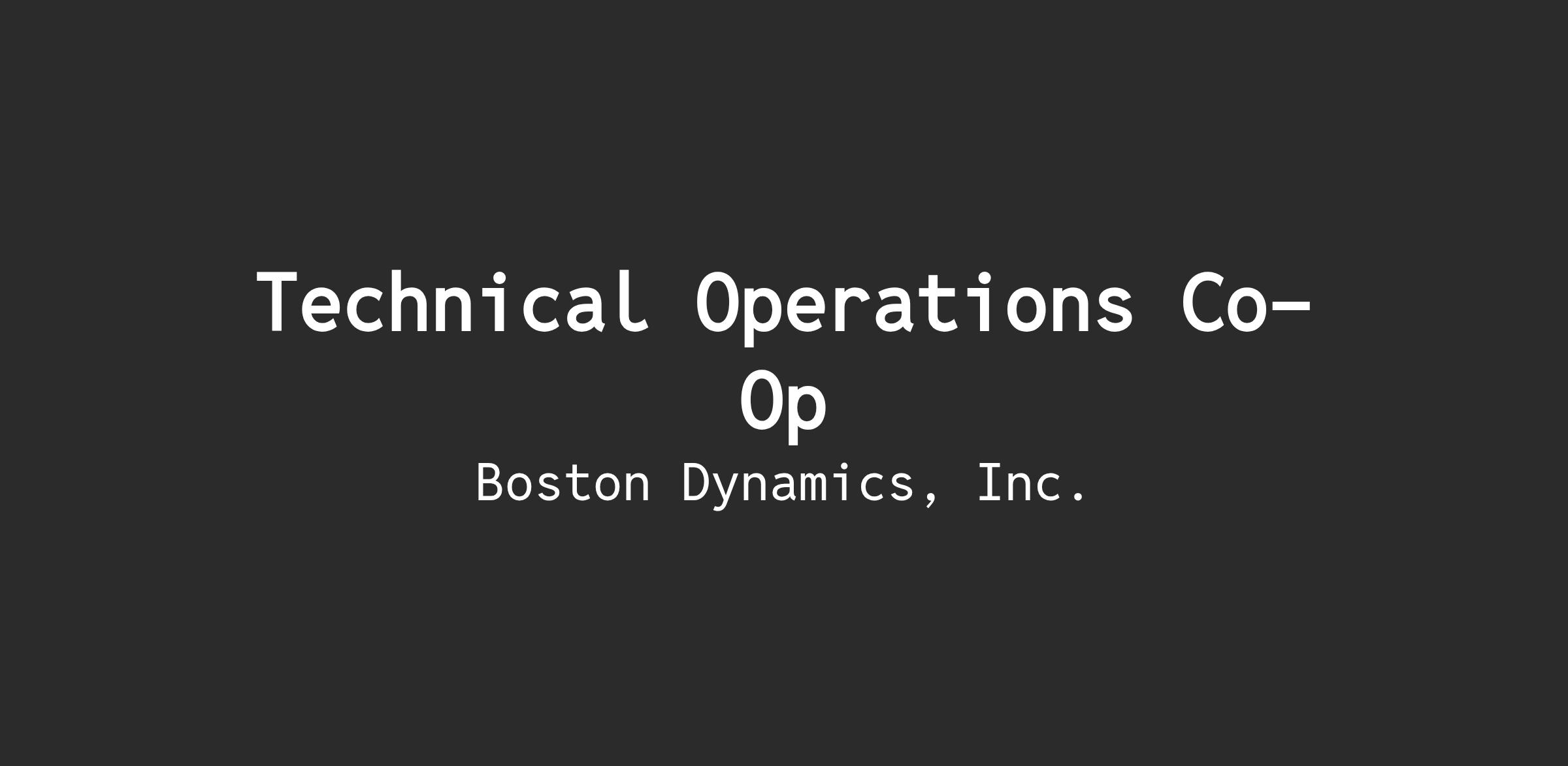 Boston Dynamics is seeking a talented, self-motivated, hands-on co-op to assist with the development, production, and testing of its robots and test infrastructure.